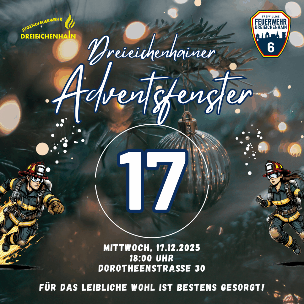 Adventsfenster Nummer 17 bei der Jugendfeuerwehr Die Adventsfenster öffnen sich wieder! Am 17.12.2025 ab 18:00 Uhr auch bei uns am Gerätehaus in der Dorotheenstraße 30Eine liebgewordene… weiterlesen
